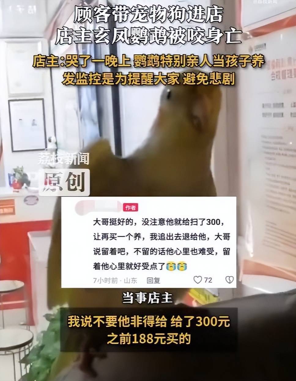 近日,山东烟台,一顾客带狗进店,不料店主的玄凤鹦鹉被狗咬身亡。