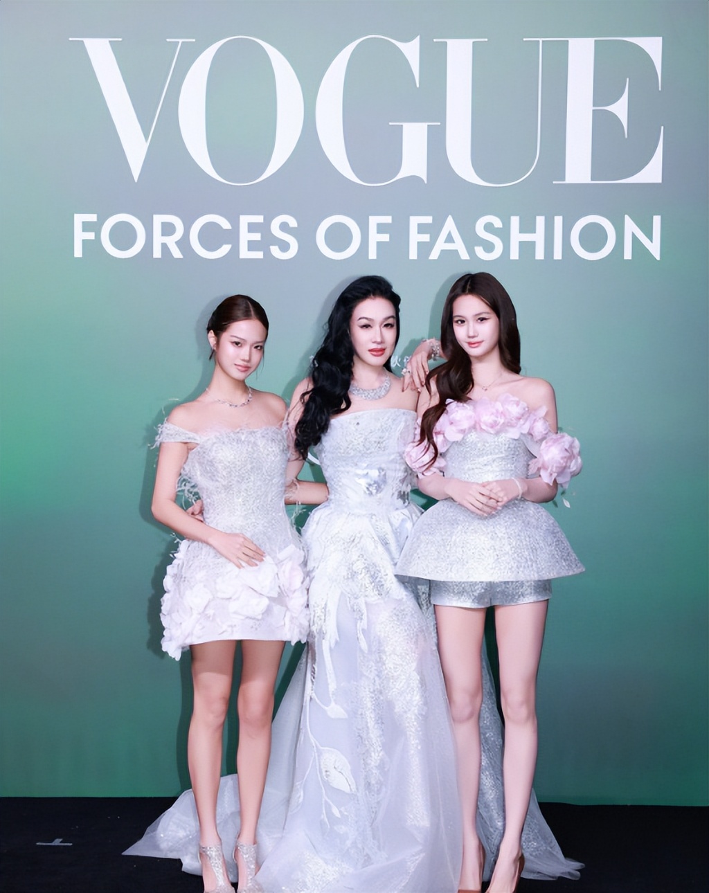 这次一起出席的还有她的两个女儿,分别站在钟女士的两侧,形成了一道亮丽的风景线。