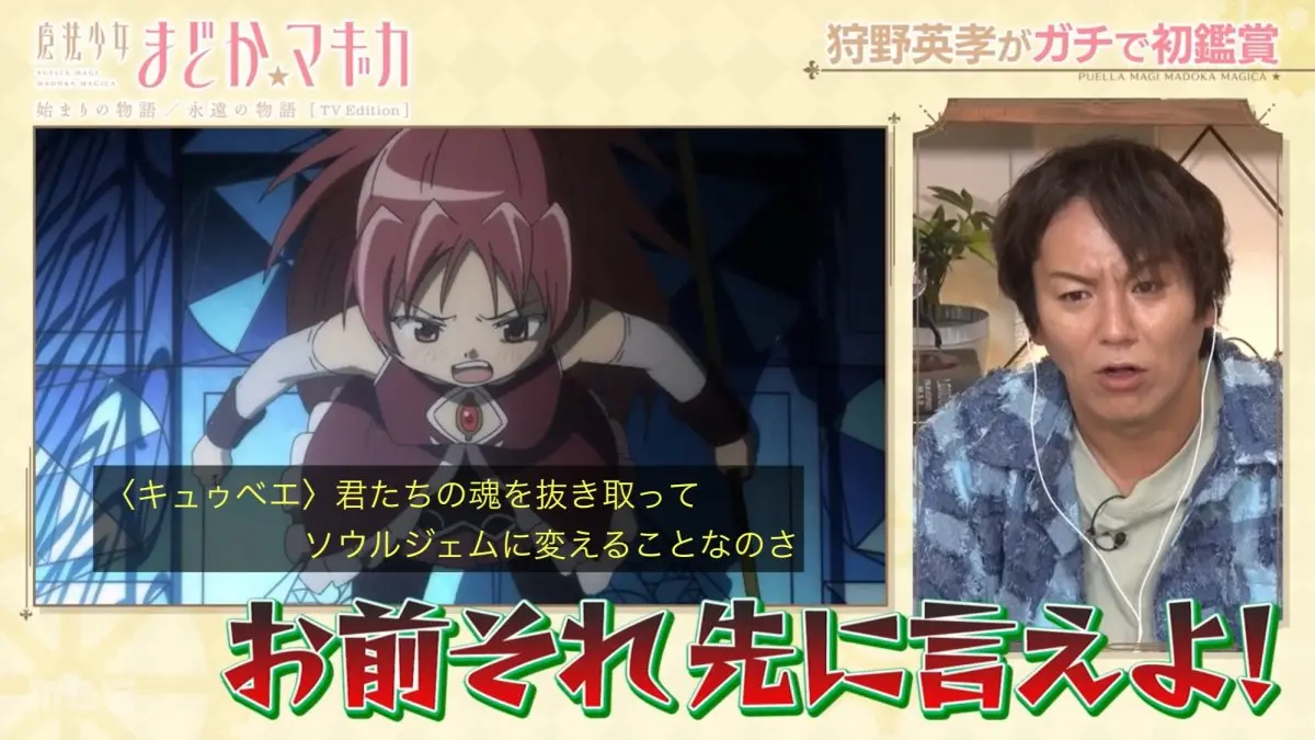 而真正的“名场面”,出现在揭露“灵魂宝石真相”的第5集。当鹿目圆不慎将沙耶香的灵魂宝石扔出,沙耶香的身体瞬间瘫倒在地时,狩野英孝的震惊几乎要冲破屏幕:“蛤!?这是怎么回事!”紧接着,丘比云淡风轻地解释——契约本质是抽取少女灵魂制成宝石,留下的肉体不过是“能活动的容器”。这番残酷告白,让狩野英孝彻底破防。