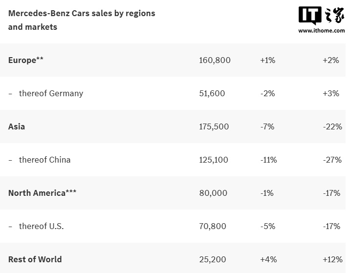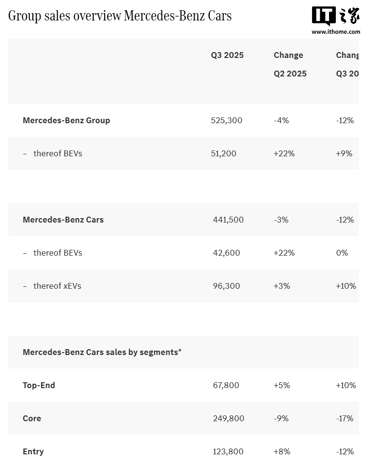 IT之家 10 月 7 日消息,梅赛德斯-奔驰集团今晚公布了其 2025 年第三季度业绩,本季度共销售乘用车与厢式车 52.53 万辆同比下降 12%,其中乘用车 44.15 万辆、厢式车 8.38 万辆。